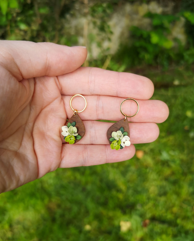 Boucles d'oreilles réalisées en argile polymère, le clou d'oreille est en acier inoxydable plaqué or fin.